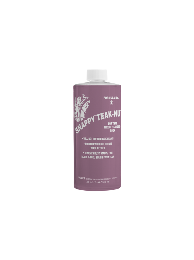 Immediately rinse off any drips, spills or splatters of Snappy™ Teak-Nu™ Formula No. 1 on painted or varnished surfaces, aluminum, fiberglass or any surface other than teak.